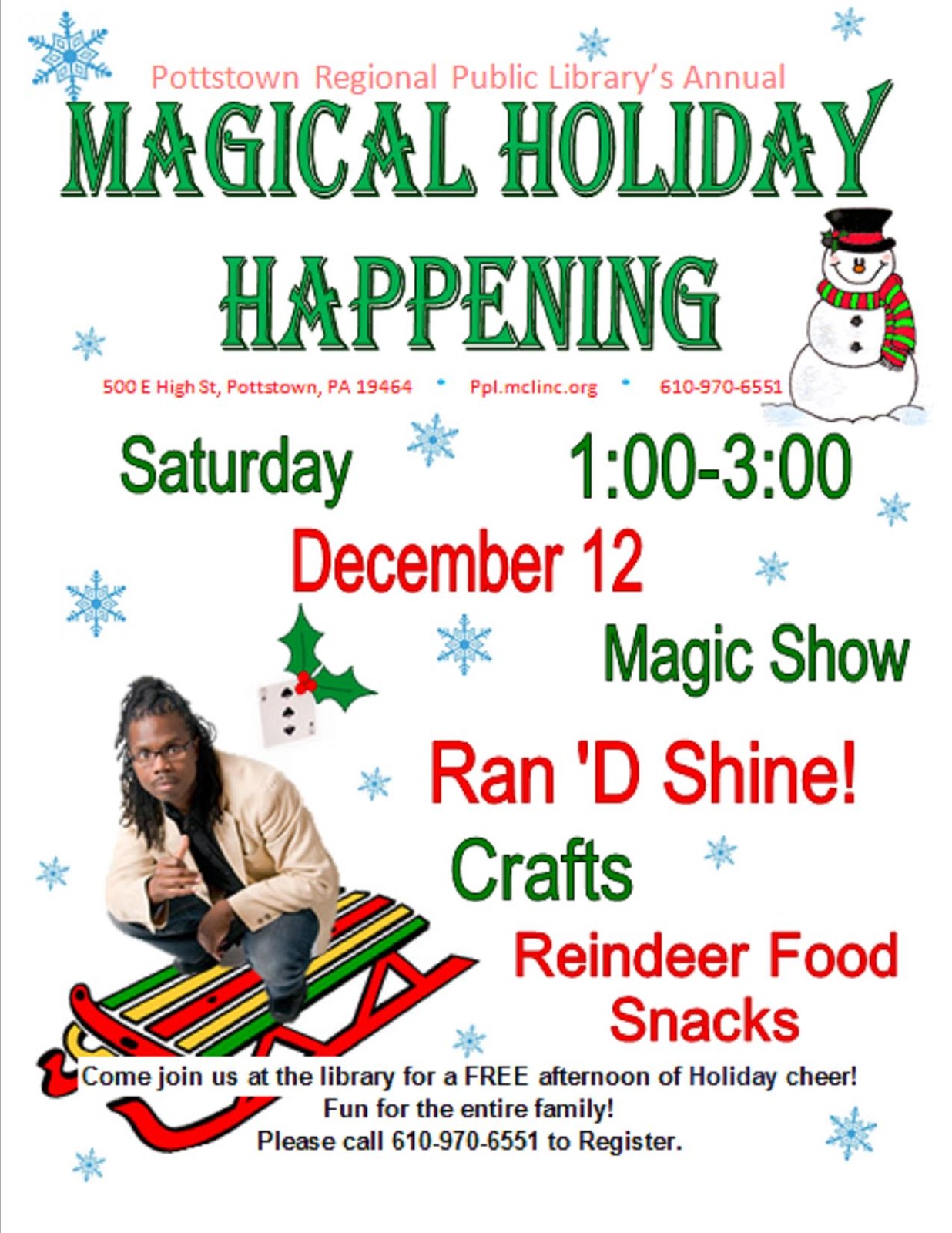 Brightening our holiday season, Ran'D Shine will be bringing his magic, humor, and love of reading to the Pottstown Regional Public Library Saturday.