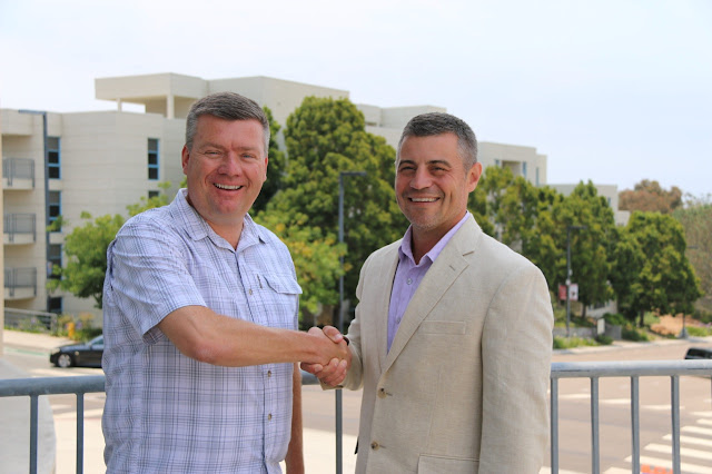 | David Ramage, former principal at Pottsgrove Middle School, left, greets Lance Rougeux with the Discovery Education Network during a conference in San Diego. |
